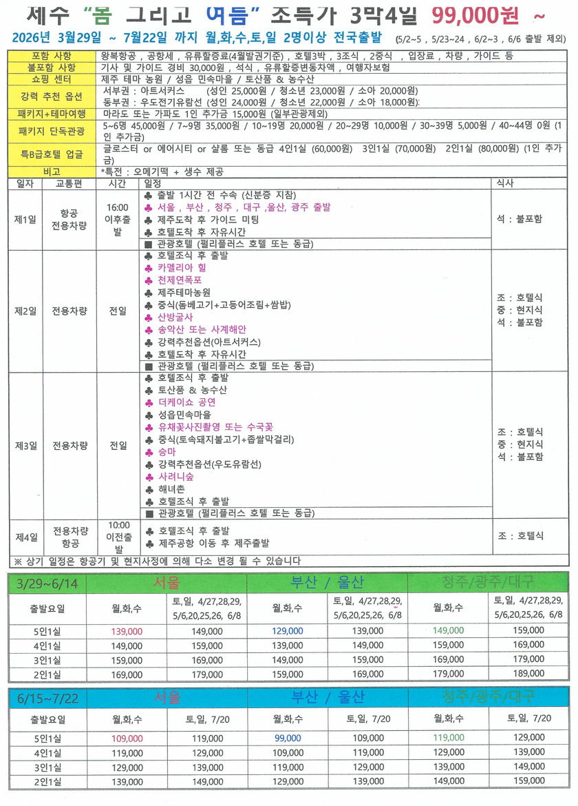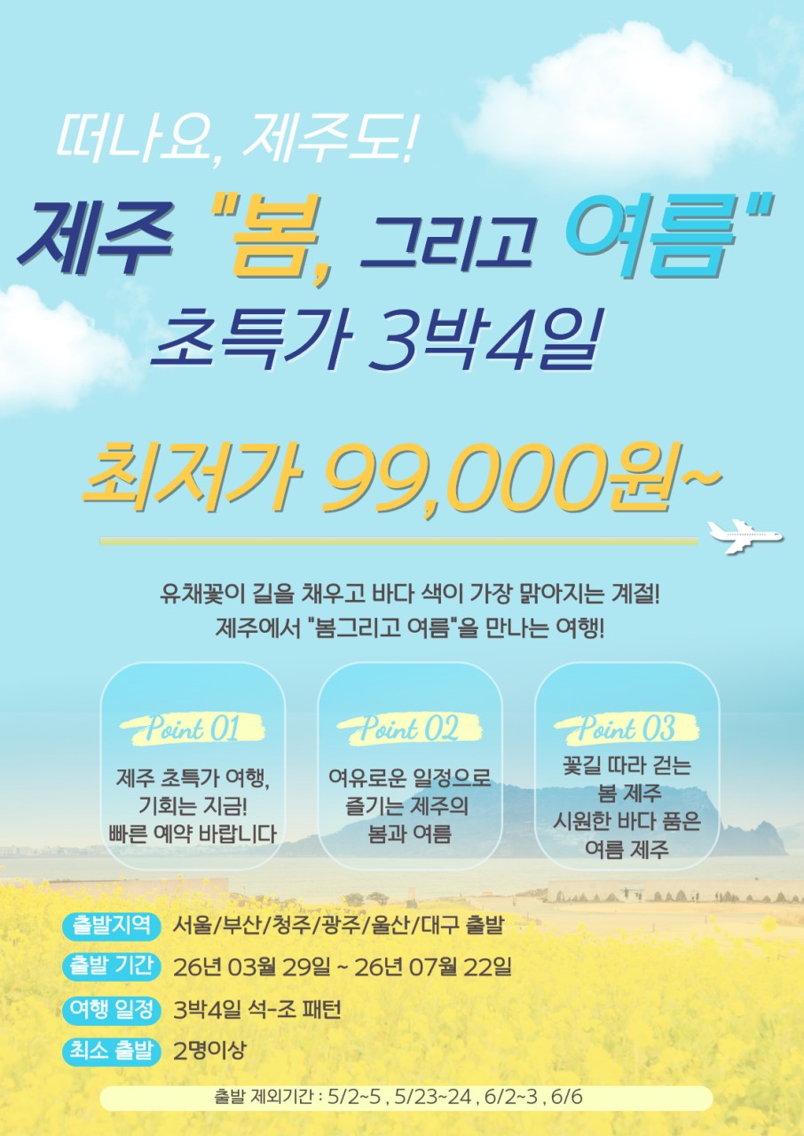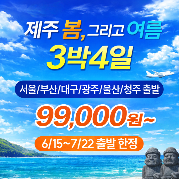 제주 봄·여름 초특가 3박4일 (서울·부산·대구·광주·울산·청주 출발)